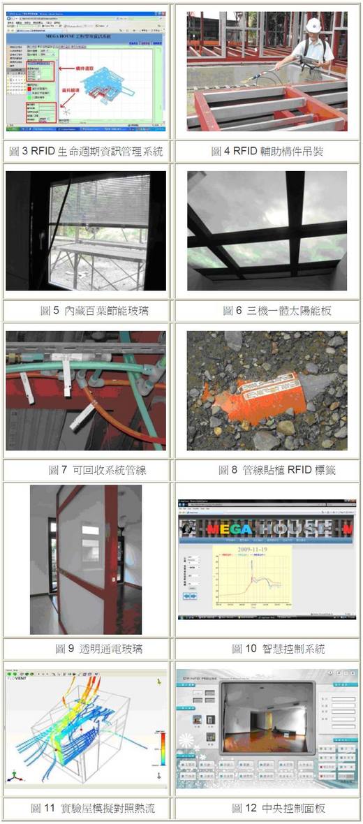 因此96年起內政部優先推動,由本所負責之『無線射頻辨識(RFID)於建築產業之應用計畫』科技計畫項下,即規劃執行『無線射頻辨識(RFID)於建築生命週期之應用-開放式建築MEGA House示範屋』計畫,執行方式係由本所委託國立台灣科技大學生態與防災工程研究中心之產學合作計畫,結合無線射頻辨識(Radio Frequency Identification, RFID)技術應用與開放式建築理念,實驗建置一開放式建築MEGA House示範屋,除了兩者技術整合外,另做為建築本體及各項先進技術創新應用的實驗整合平台。