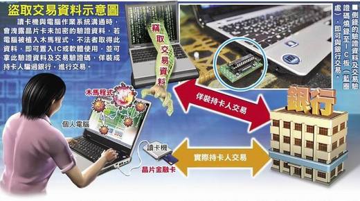 用晶片金融卡進行網路ATM交易出現安全疑慮。竹科工程師Jim向《蘋果》揭露,他測試台灣晶片金融卡卻發現交易安全機制有漏洞,號稱無法被複製、偽造的晶片卡,在網路ATM交易時不僅會洩露驗證資料,還能藉此偽造「未來交易」騙過銀行,他說,駭客若製造木馬程式病毒發動攻擊,恐造成用戶損失。高手爆料
