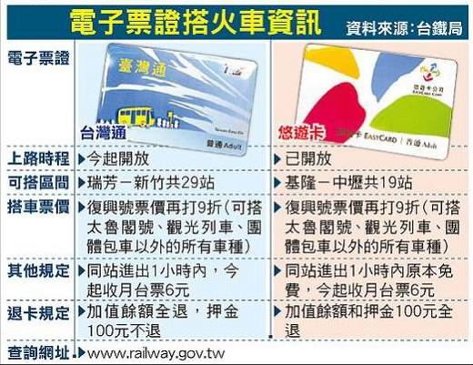 繼悠遊卡可用來搭火車後,今起新增「台灣通」電子票證也可搭火車,台灣通開放瑞芳──新竹間的二十九站使用,範圍較廣,悠遊卡則僅限基隆──中壢間的十九站,搭錯區間得補全額票價。
