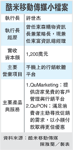 酷米執行長許世杰昨(25)日表示,對微利經營的中小企業主來說,「掌中行銷QuMarketing」軟體就是一個微型顧客關係管理服務平台,透過電腦或蘋果iPhone,就可輕鬆管理顧客資料、發出促銷訊息、更精準和主動搜尋優惠資訊的消費者溝通。