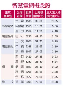 替代能源當紅,智慧電網概念股風起雲湧,為了搶攻2020年的4.5兆人民幣商機,中國電力及電器業者結合國內大廠全力出擊,除了主攻智慧電錶的士電、亞力等公司外,具智慧電腦概念並與中國業者攜手合作的公司,則有研華、泓格、康舒、新巨、盛達、正文、中磊等都浮上檯面。