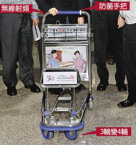 桃園國際機場今年陸續購進的5200部手推車,具備多種新功能,4輪方便未來機場捷運通車後的上下樓梯需求。無線射頻系統〈RFID〉,方便定位、搜尋,旅客即使任意放置,管理人員也能很快找到,避免手推車不夠用。