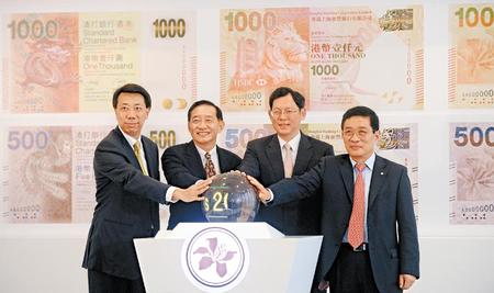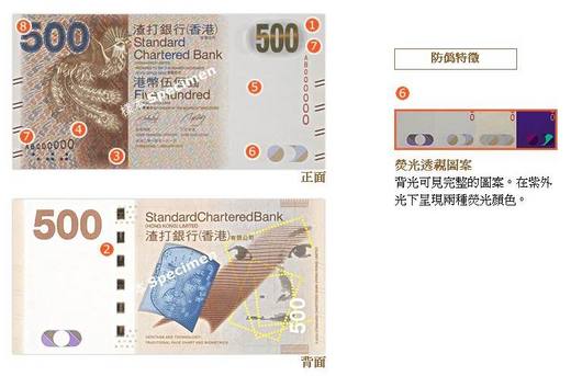 至於新鈔版面設計,三家銀行各有特色。渣打(香港)行政總裁洪丕正表示,千元新鈔正面是五指金龍,背面是「開元通寶」古錢幣及無綫射頻辨識技術(RFID)的對照;五百元新鈔正面是鳳凰,背面是古時的面相學與現代人臉辨識技術的對照。兩者均屬香港發明,極具代表性。