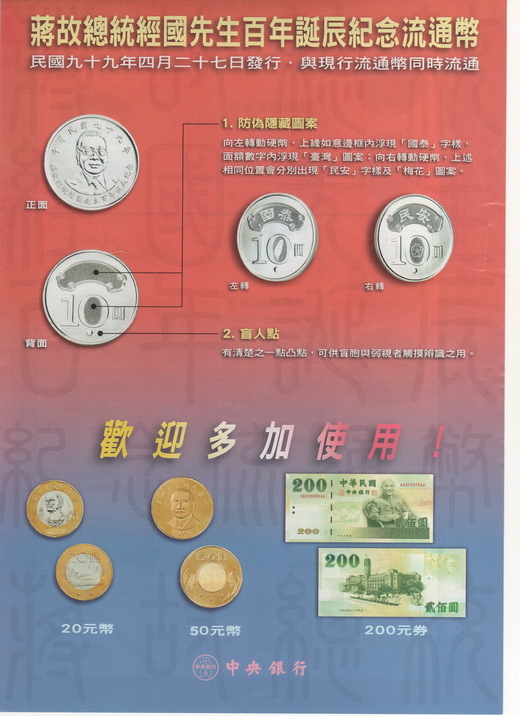 央行登廣告,介紹蔣渭水與經國先生流通紀念幣的防偽設計,防偽隱藏圖案從目前的「數字」,進階到「文字」和「圖案」。央行指出,提升防偽功能,先從不定期推出的紀念流通幣著手,將來有機會,再擴及到十元和五十元硬幣。