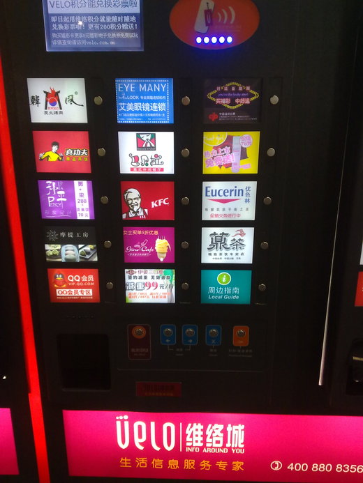 真正引人注目的是排列在機器上、印有各種餐飲娛樂品牌的小燈箱,麥當勞、必勝客、永和大王、麥樂迪……皆是深受大眾歡迎的品牌。