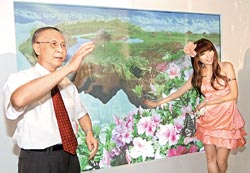 下圖:中華電信為2010臺北國際花卉博覽會的合作夥伴,負責展覽現場的通訊設施,為因應參觀人潮,28日在台北京站公開互動式『幸福花屋』,使用語音、QR code及NFC技術讓手機成為個人隨身的導覽解說員,民眾可在這搶先體驗,使用手機上網查詢花卉資料、花博會新聞與展區地圖等便利措施。左圖:現場中華電信副總李炎松(左)與蝴蝶姐姐(右)並示範互動式投影遊戲。(張鎧乙攝)