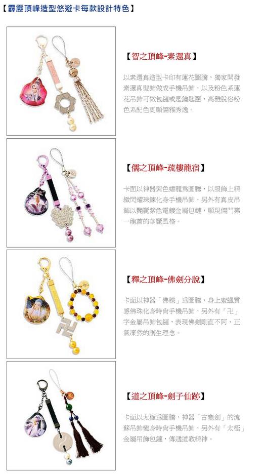 ◎特色:水滴造型悠遊卡,有素還真、疏樓龍宿等4款卡面,搭配專屬手機吊飾及鑰匙圈