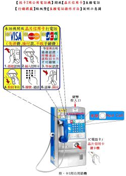 中華電信8千多座支援信用卡付費的電話機均貼有開放晶片信用卡付費的標籤,將可支援VISA、MasterCard、JCB等晶片信用卡消費。使用時拿起話筒並插入信用卡,等待系統與銀行以DES加密連線進行認證,授權通話後話機螢幕顯示可取出卡片,民眾就可以開始撥號通話,直到掛上話筒結束通話為止,所有通話金額顯示在話機螢幕上,金額隨信用卡帳單發出,每次允許通話額度為200元。