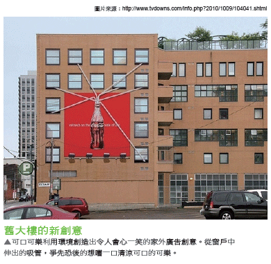 一棟破舊的大樓,牆面佈滿排排站的窗戶,看上去平凡無奇,甚至枯燥單調的有點醜陋。不過,可口可樂卻替老舊大樓帶來全新的面貌。經典的可樂瓶貼掛在牆上,大樓牆上滿滿的窗戶伸出數支吸管,好像家家戶戶的住客,都搶著喝這口可樂。戶外大樓廣告,巧妙的利用環境的特色,塑造出獨樹一格的裝置藝術。