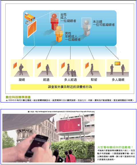 大街小巷牆面的看板、街道家具、交通車體,捷運廣告和霓虹廣告……這些家外媒體,就像城市的化妝師一樣,把一棟棟高樓大廈妝扮地五彩繽紛,每一個廣告都點出一個品牌和人們的關係。然而家外媒體在數位科技的推波助瀾下,一個一個大型的電子看板,不但改變了城市的樣貌,還改變了消費者接收訊息的模式-在街頭你可以把電子螢幕當成自己的遊戲機;只要用手中的智慧手機,你可以追蹤任何從戶外媒體獲得的資訊。