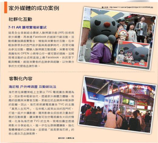 互動式的家外媒體,把網路社群的概念放進戶外廣告,不但增加品牌與消費者互動,還能延續品牌知名度,各式極富創意的行銷巧思,也替家外媒體行銷創造新的可能。更多福斯汽車、皇家哥本哈根的國外精采案例,請參考「精湛創意 看板廣告活起來」(P.88)。