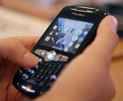 圖: 根據最新研究顯示,手機付款將越來越普遍,成為消費新趨勢。圖為一名使用者展示其所用的黑莓機。(法新社)