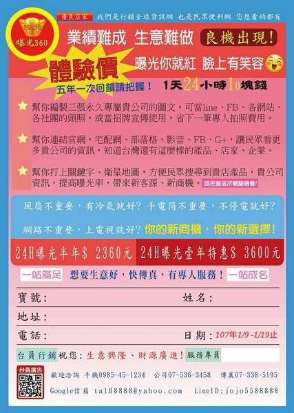 另加碼會在台員廣告網,24小時曝光一年,幫您打響名號。台員第一次回饋,新店家體驗專案,讓您更認識台員廣告,打響名號現在正是時候,一定要把握,全部一年365天,費用只有$ 3600元而已,我們編製約3-7天時間讓您對圖,即日起回饋,是在做義工,名額有限,請積極把握。