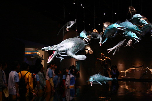 館長張天傑說,特展分為九個主題展示區,雙孔類爬行動物系譜、地質時間與板塊運動、游走於兩界之間、滄龍類群、蜥鰭類群、鱷型動物、海龍類群、魚龍類群、與瘋狂的古生物學家研究室。
