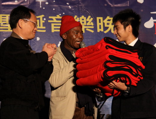 昨天晚會上,在台灣服務20多年的非洲剛果籍高福南神父從教會手中,接受老神父積蓄所購買的150張以回收寶特瓶分解後,所製作的環保毛毯,這批物資將在明年7月,由高福南神父率領彰化高中青年志工,送到史瓦濟蘭,幫助愛滋病孤兒度過寒冬。