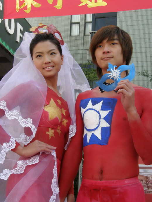 兩岸江陳會剛落幕,腦筋動得快的台中婚紗業者馬上打出「江先生、陳小姐想通了?」為今天開始的婚紗展打響名號。俊男美女模特兒,身上以彩色顏料分別畫上中華民國國旗與中華人民共和國的五星旗,上聯「袒裎相見」,下聯「共創未來」,橫批「江先生、陳小姐,想通了?」話題十足。