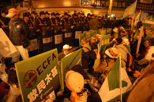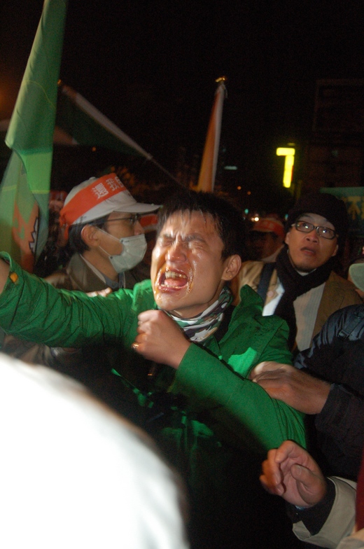 【記者洪敬浤、熊迺群、趙容萱/台中報導】民進黨大遊行昨天和平落幕,但首波衝突深夜爆發。昨晚11時,本土社團率200人在江陳會場管制點前靜坐卅分鐘,警方兩度舉牌後,群眾在管制區外繞行,零時左右,試圖穿過管制區發生擁擠,二名民眾及一名警員,被一名警員自備的瓦斯噴霧器噴到送醫,分局長盧進隆脖子被抓傷,群眾在零時卅分散去。