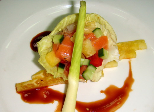 餐旅系教授鄭錦慶說,把鳳梨切成小丁狀,與新鮮鮭魚肉、山藥、小黃瓜混合攪拌,放在生菜葉上,淋上和風醬再撒上白芝麻,就成為「鳳梨和風生菜」,是夏日美味料理。