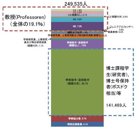 但是,只能留在台灣的孩子和家長怎麼辦呢?台灣的未來怎麼辦呢?當然只有祈禱ㄧ途了。在台灣,最難撼動的體系可能是大學。我舉ㄧ張圖,這張圖台灣的大學應該不敢看,更不敢提。德國2017年大學教員總數接近25萬人,其中56%是博士生或博士後,這帶動了教育體系的良性循環,但這在台灣鐵被教授吐口水!