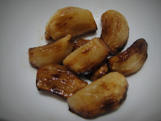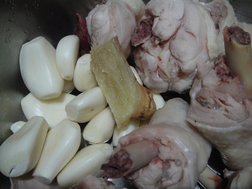食 材:切塊的雞腿四支、大香菇10朵、較大顆的蒜頭20個、薑片(可依人數斟酌食材量)。