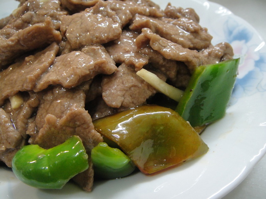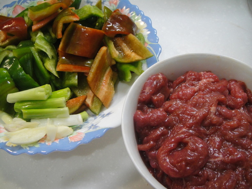 食 材:傳統市場裡的新鮮菲力牛肉片100元、青椒3個、蒜片、蔥段(還可放一些薑米)。