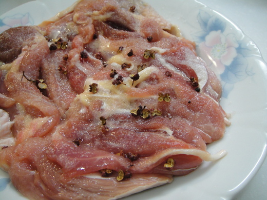 二、將乾煸過的鹽與花椒,薄薄一層,均勻塗抹在雞腿的兩面,放入冰箱一夜,風味更佳。
