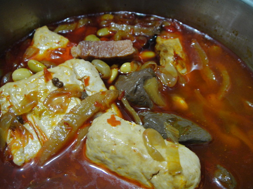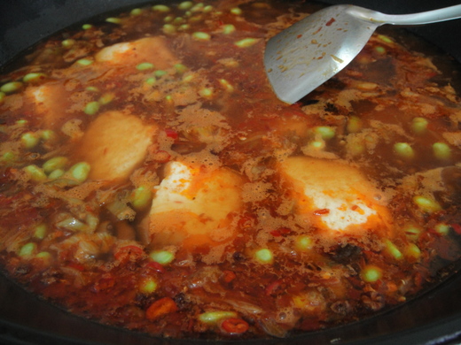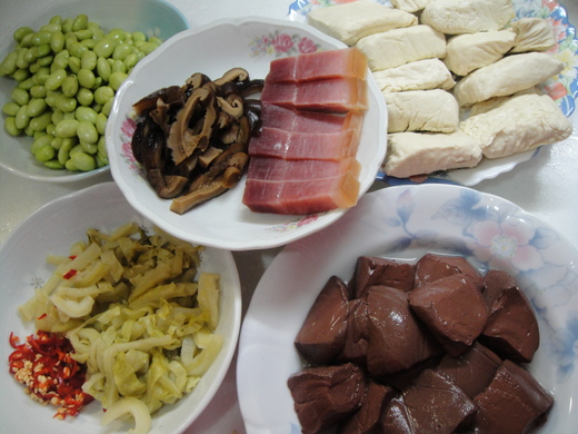 食 材:臭豆腐十片、鴨血一塊、毛豆仁50元、酸菜心兩片、金華火腿數小片、花椒和新鮮辣椒二根、蒜片。