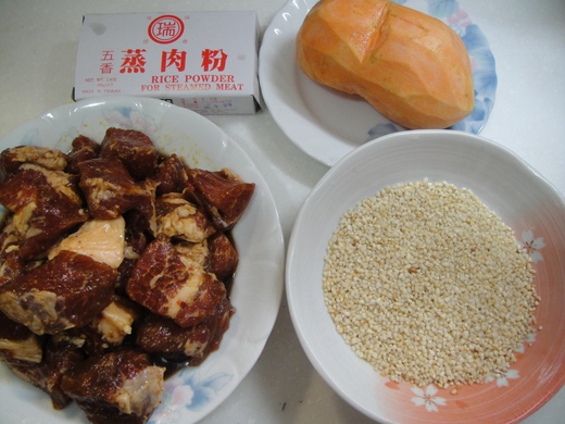 食 材─梅花肉塊、地瓜、蒸肉粉。