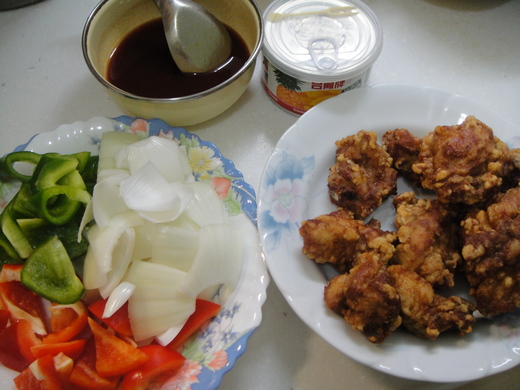 調味料─油、醬油、白醋、蕃茄醬、味霖(或糖)、米酒、地瓜粉。