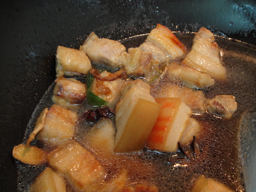 三、起油鍋,爆香薑片與蔥段,放入肉塊翻炒,調入冰糖、八角、醬油、米酒和自來高,滾沸後燒至肉塊上色,蓋上鍋蓋用小火燜煮約30~40分鐘。
