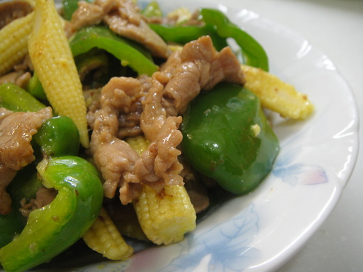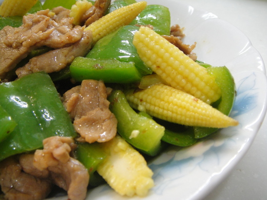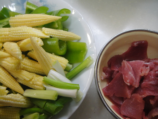 食 材─玉米筍、青椒、小里肌肉片、蔥。