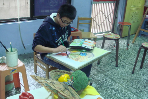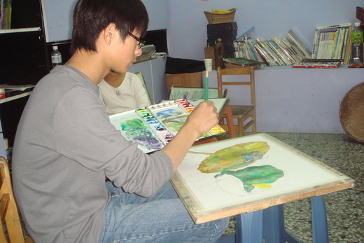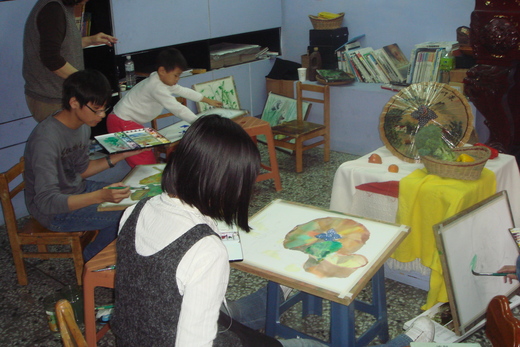 姐妹檔心筠(不喜歡照相神秘又可愛的少女)、柔柔(有小美女之稱,下次介紹她與她的作品)家裡養了很多小動物,有大狗、小狗、小貓、兔子.........,還種了很多蔬菜、水果,有時候畫畫需要提供小動物外還提供。例如:未成熟的香蕉、整顆未成熟但是造型很美的高麗菜...........,都是由她們帶到教室讓大家畫。