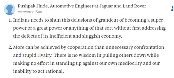 “1、印度人還是避免妄想成爲超級大國之類的,在解決自己緩慢發展的經濟問題之前吧。2、加強合作會比那些不必要的對抗和愚蠢的競爭獲得更多……拉別人下來是没有智慧的。”