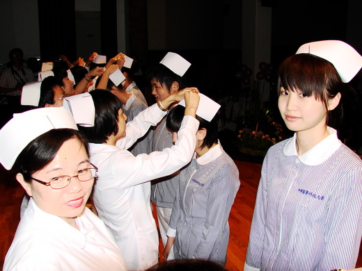 ,系主任李碧娥等20名老師為學生一一戴上護士帽,並將象徵「燃燒