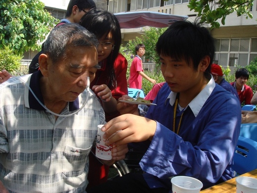 互動,學生對老人家噓寒問暖、還有人用手掌為阿嬤遮太陽,貼心的