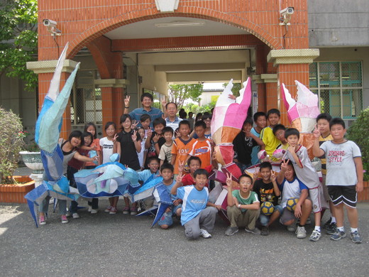 七股鄉國小師生日前利用下課時間和大螃蟹花燈合影留念;學童陳建