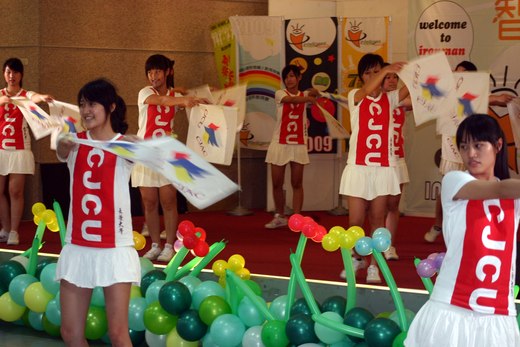 表演迎賓校旗舞與競賽大會舞,台下參賽學生目不轉睛、目瞪張口呆