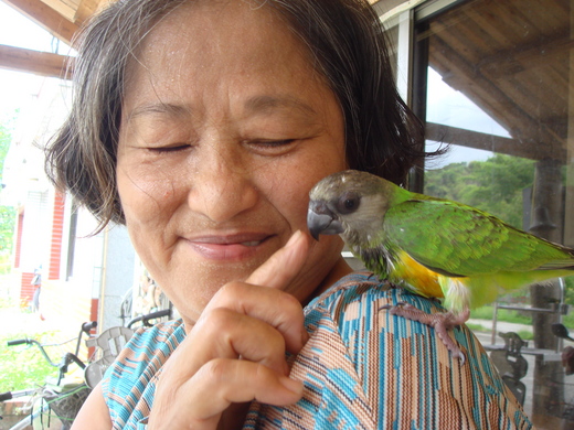 王杏珍有「鳥媽媽」之稱,飼養的金剛鸚鵡都是從小飼食長大