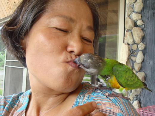 採訪當天,王杏珍逗著金剛鸚鵡玩,沒想到金剛鸚鵡真的湊上嘴,獻上熱情的一吻。