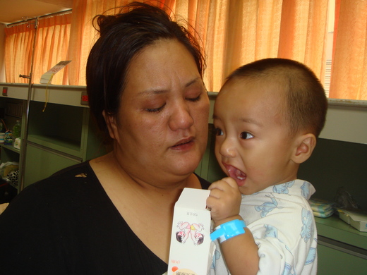 九個月大的林小弟弟,被媽媽田美菊抱在懷中,也露出滿足的笑臉,但之前四天,他跟著大人逃難,只喝山泉水或泡麥粉喝,淋了四天雨,幸好只是身上起疹子,沒有發燒生病, 田美菊欣慰之餘,想到親人還在山上沒有找到,不禁又流下眼淚。