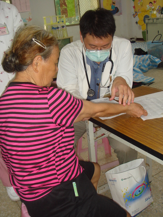 這天遇到奇美醫院義診服務,請教了一下醫師,才知道腳扭腳若不處理,會變成慢性的「風濕」,天氣變化就會不舒服。醫護人員建議我接受「義診」,於是就跟著災民一起填資料、看診後,領了一包藥。(有點不好意思)