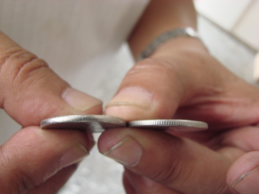 手中看了一下,挑出其中一個是偽幣,店員說,偽幣旁邊是光滑的,