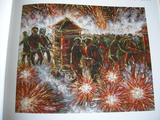 陳兆熊畫的油畫「鹽水蜂砲」,蜂砲迸射,抬轎者與觀光客全副武裝