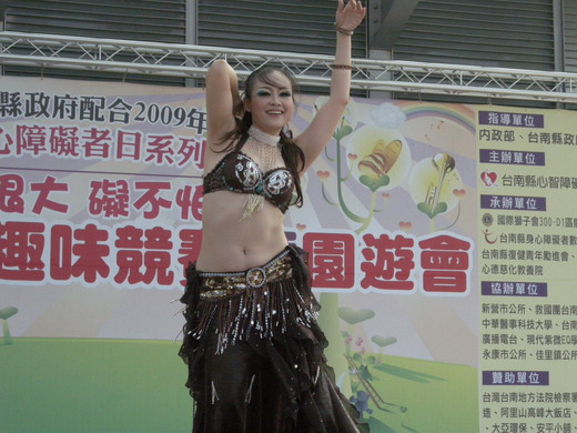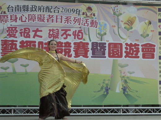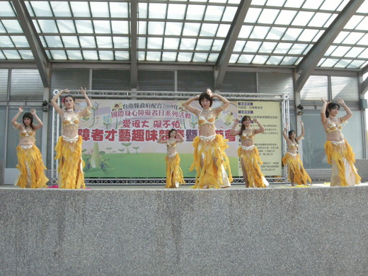 台南縣政府昨天在新營市南瀛綠都心公園,舉辦國際身心障礙者日系列活動,身心障礙者熱情參與趣味競賽、槌球、闖關等活動,展現雖然肢體障礙,但心靈沒有障礙的精神。台南縣新營社區大學演出的肚友舞,熱情洋溢,獲得全場熱烈掌聲。圖與文/劉金清