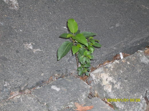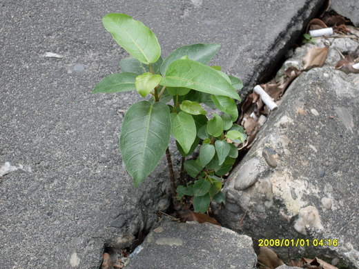 植物生理學課有提到植物的抗逆性,圖片中的榕樹幼苗應是實例。這棵小榕樹長在我上班的飼料廠倉庫水溝邊,其母樹在十幾年前因颱風吹倒而移植他處,不知何時竟冒出新的生命。園藝雖才入門,但也給我另一種的啟示!