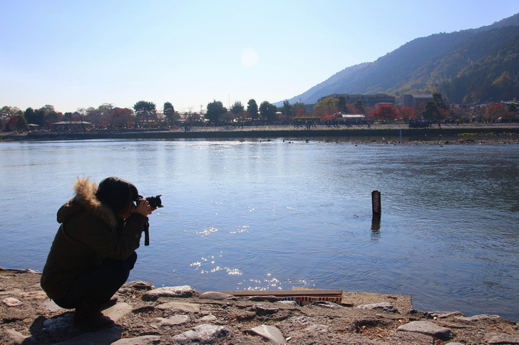 渡月橋像是攝影團體的集合地點,眼見觀光客人手一機單眼相機。
