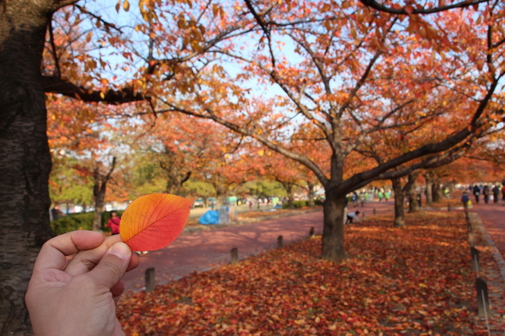 圖中手拿紅葉是櫻花葉 到秋天由紅轉金黃相當漂亮....