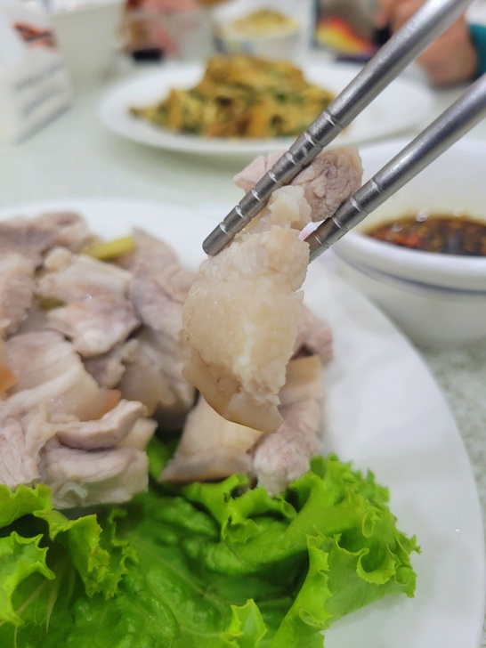 現燙現切毫無腥味的白肉,沾上蒜蓉醬油,有滋味又有咬勁。