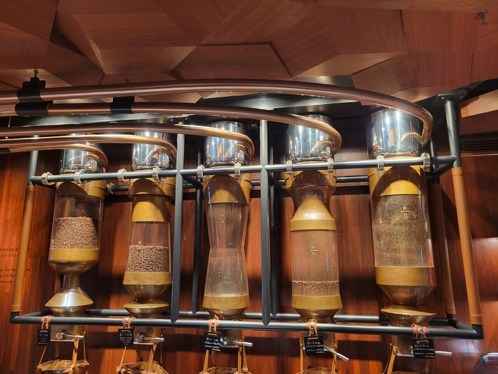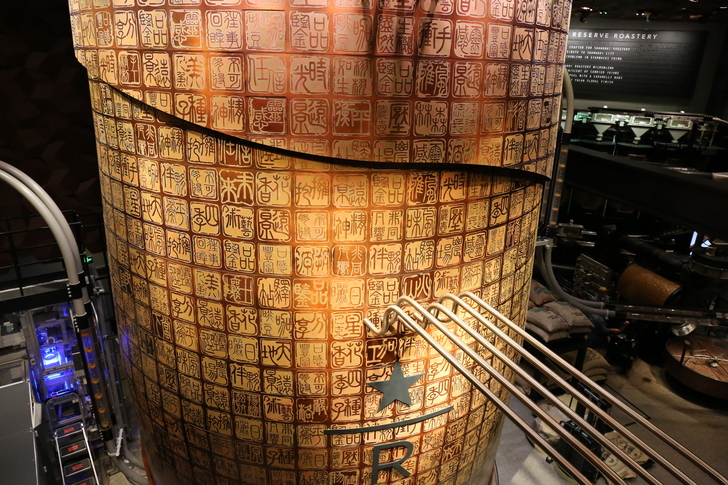 咖啡廳的中央有著一座巨大烘豆機現場運轉,這重達40噸的銅製烘豆機外表裝飾著上千個中國傳統印章篆刻。可以邊喝咖啡,邊看咖啡豆的烘焙過程,不只看到,更聞得到。