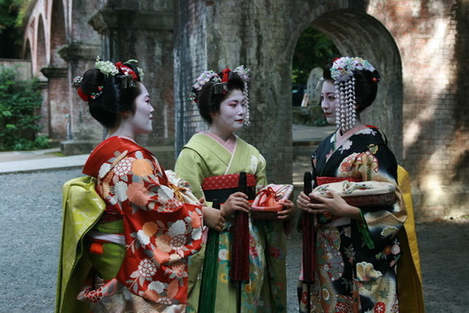 嗯...這三位姊妹花,觀光客的鎂光燈好像都集中在其中一位身上。可能是圍觀的人太多了,讓她的臉色變很難看。好可惜啊!這麼漂亮的臉蛋上竟然沒有笑容。不過,我喜歡她那目露凶光的眼神,很有殺氣!像電影中藝妓的真實感覺。她好像在對我說:「喂!你倒底拍夠了沒?!」